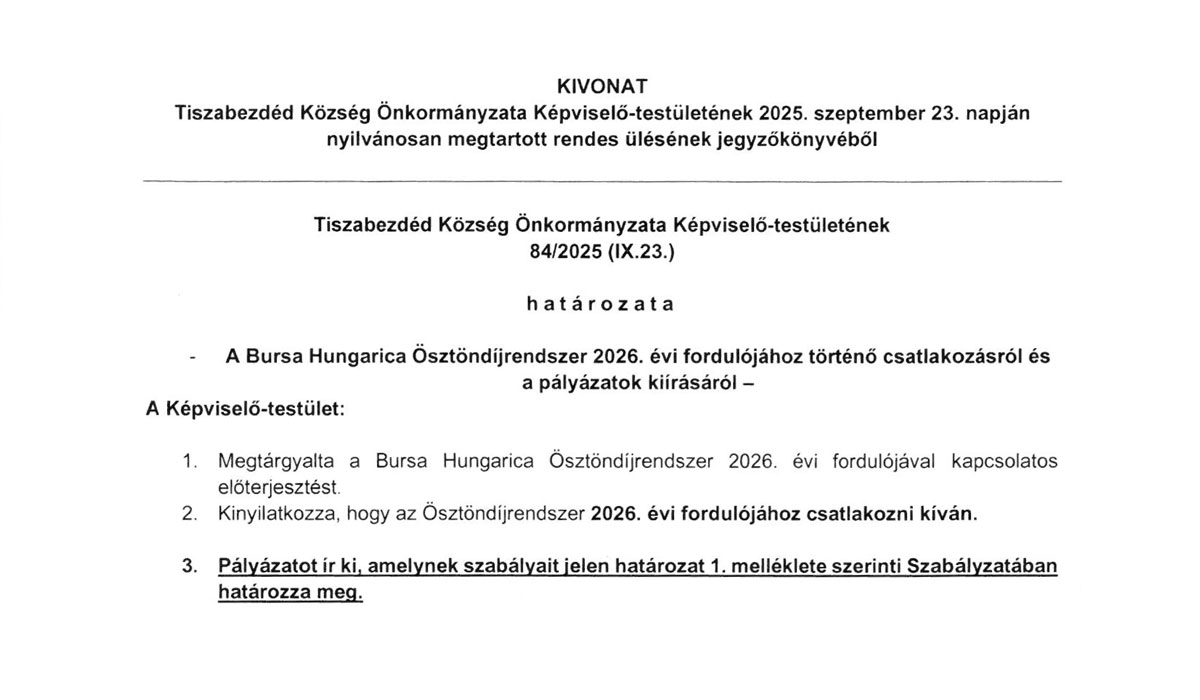KIVONAT – Tiszabezdéd Község Önkormányzata Képviselő-testületének 2025. szeptember 23. napján nyilvánosan megtartott rendes ülésének jegyzőkönyvéből